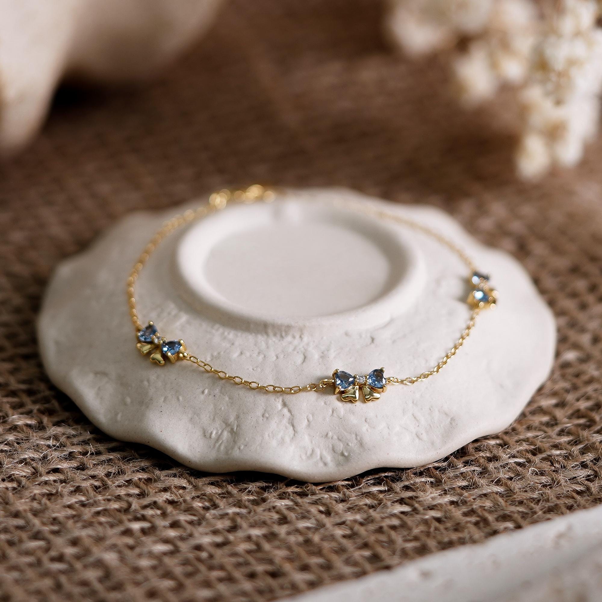 Dainty Bow Blue Diamond Bracelet, Multi Bow Sterling Silver Bracelet, CZ Charm Bracelet for Daughter, Birthday Gift for Her, Bridesmaid Gift