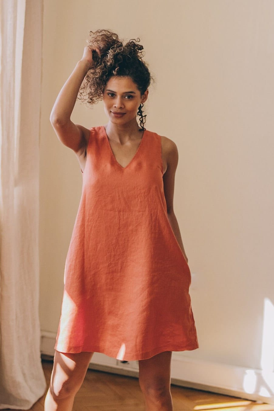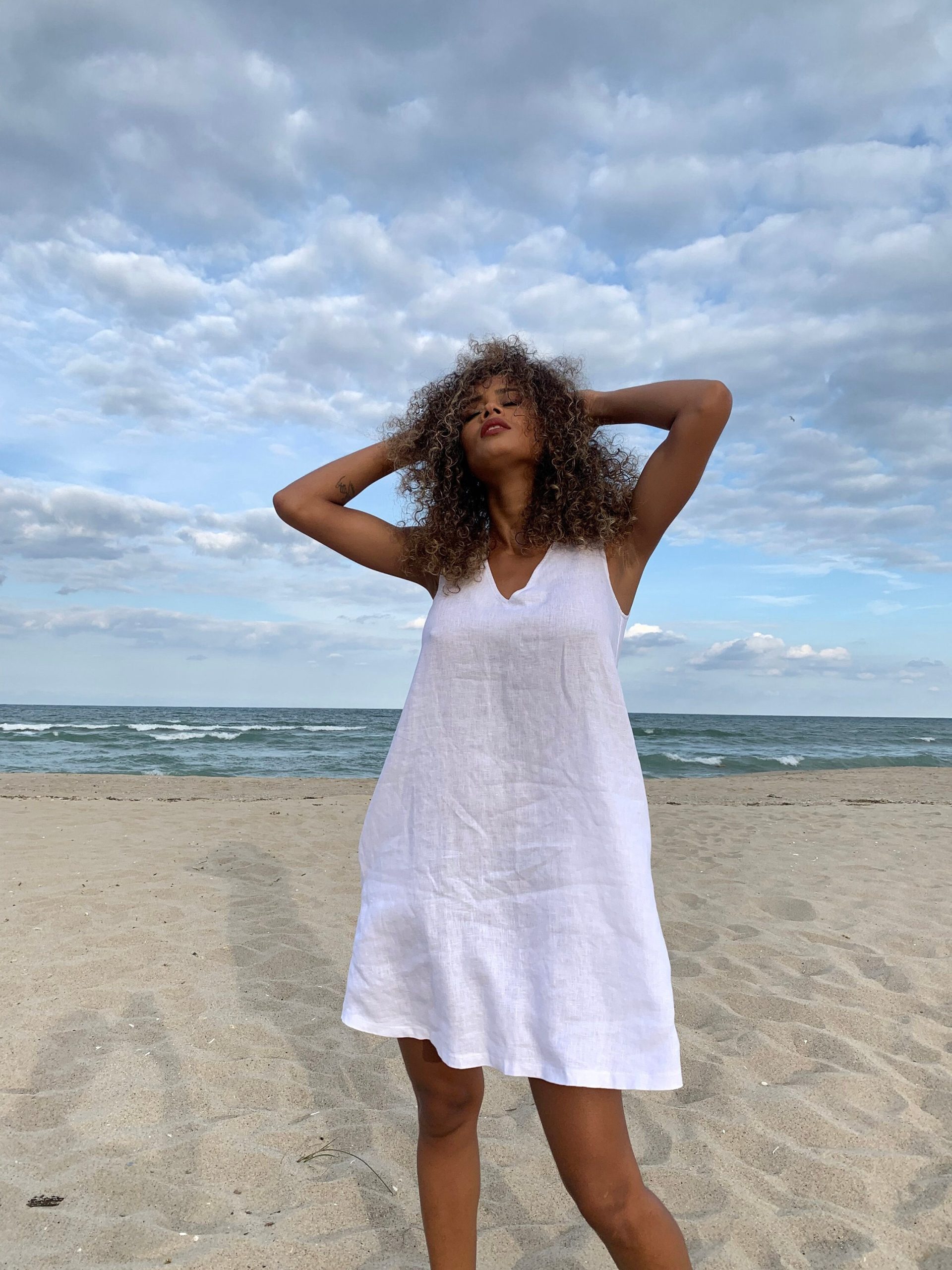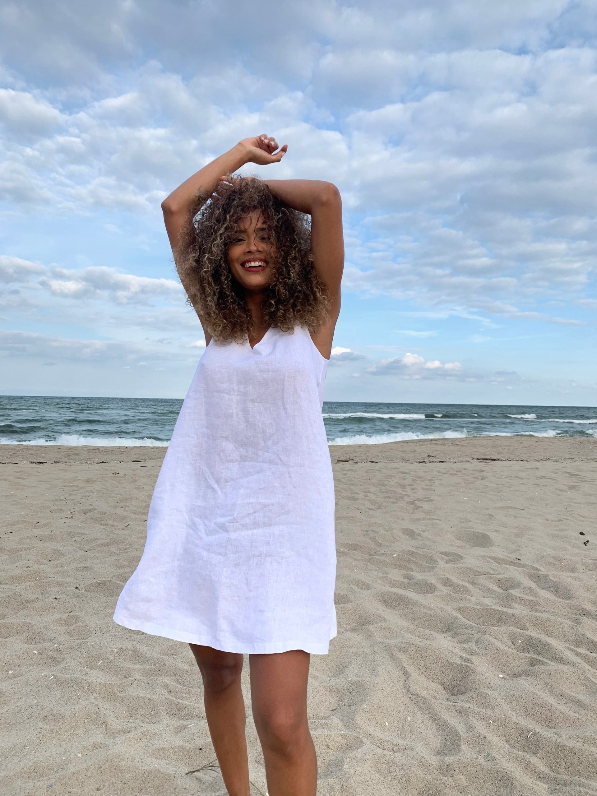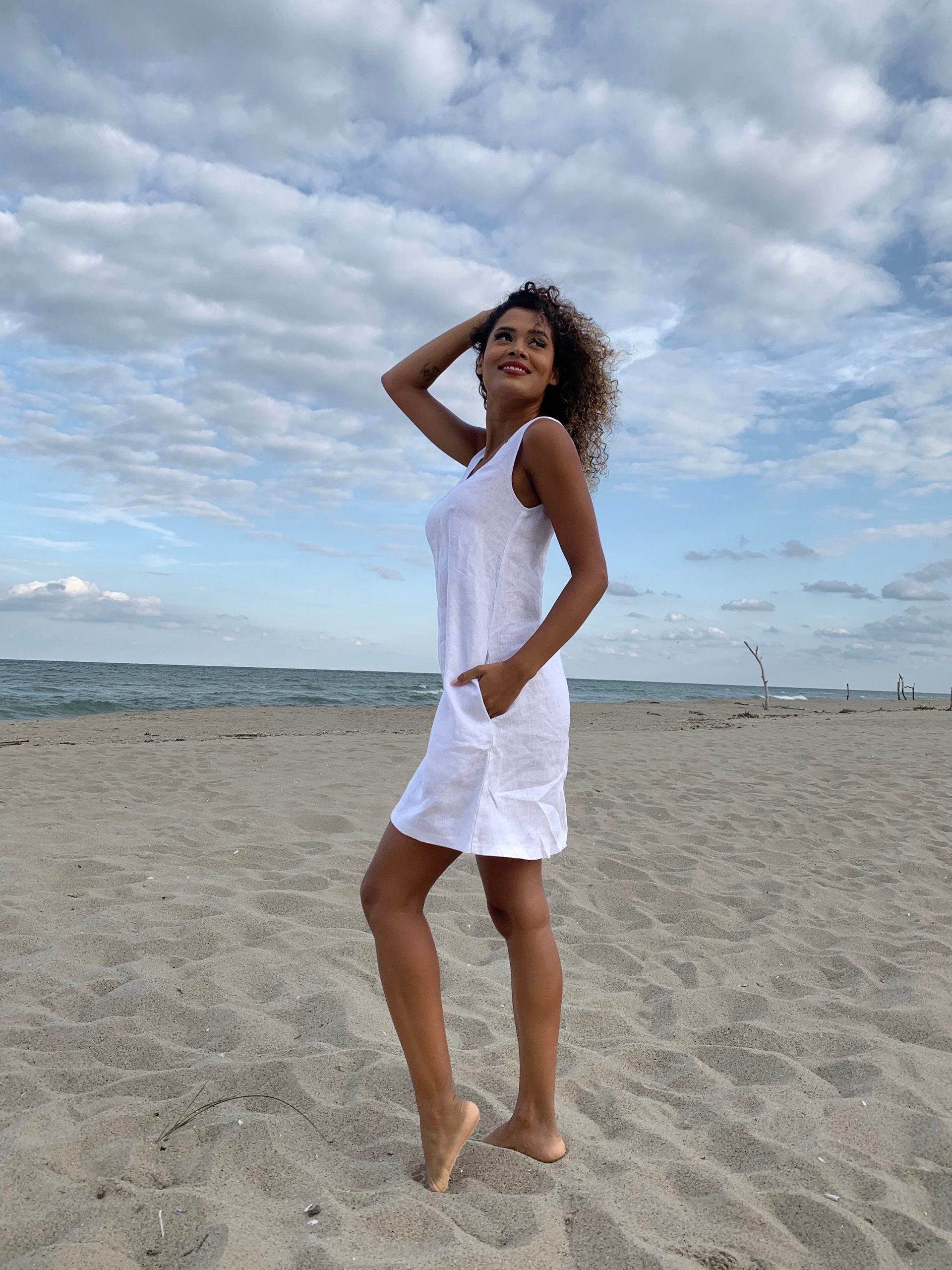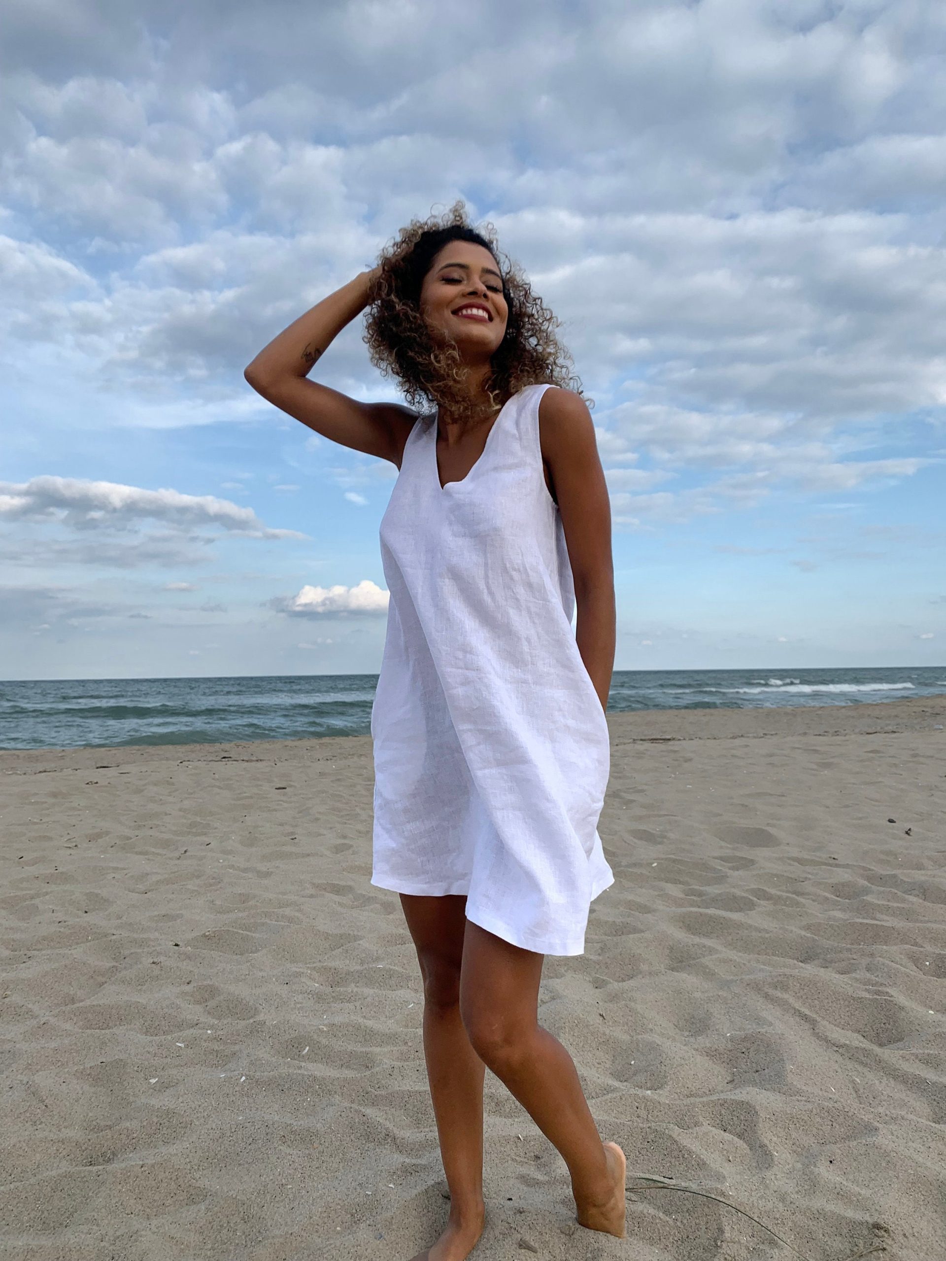 Sleeveless minimalist linen short dress – perfect match for bold jewelry. Short and soft, this dress is made of pure linen that is breathable and pleasant to your body. A classic and elegant style for your summer everyday wardrobe. Pictured in White shade here, this dress is also available in other beautiful colors